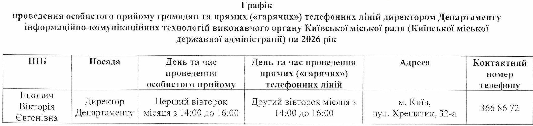 Графік проведення особистого прийому громадян та прямих («гарячих») телефонних ліній директором Департаменту інформаційно-комунікаційних технологій виконавчого органу Київської міської ради (Київської міської державної адміністрації) та його заступниками у 2026 році