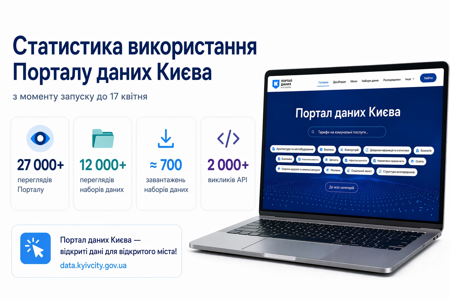 «Ми уважно відстежуємо взаємодію з Порталом даних. Наразі маємо більше 27 тисяч переглядів Порталу, 12 тисяч переглядів наборів даних і близько 700 їх завантажень. Окремо варто відзначити активність професійної спільноти: зафіксовано більше 2 тисяч викликів API, що свідчить про потенціал використання міських даних у сторонніх сервісах і додатках», – зазначив Дмитро Загуменний.