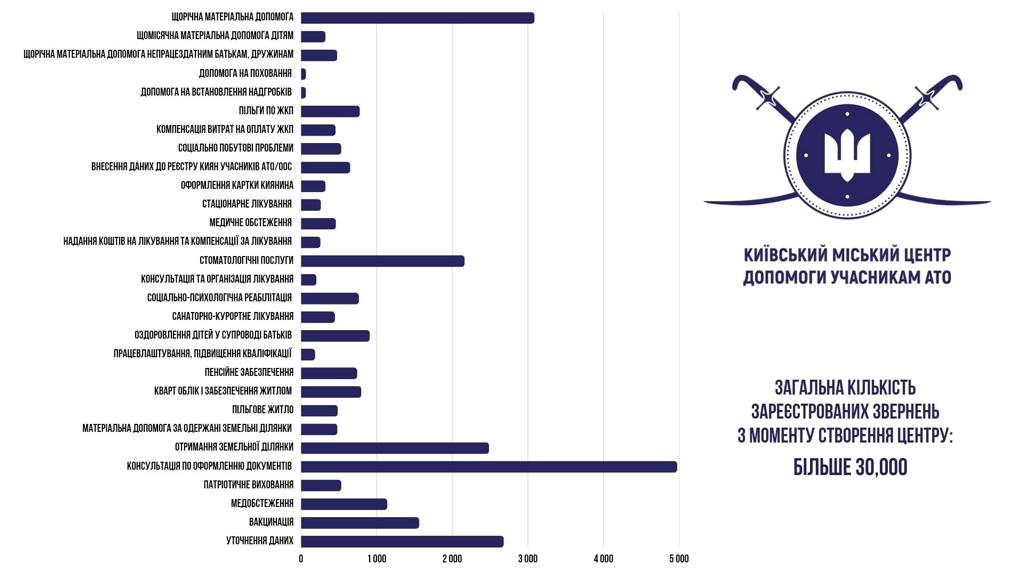 «Міська влада постійно працює над удосконаленням системи надання допомоги нашим Захисникам та членам їхніх сімей. Зокрема, забезпечує оздоровлення, соціально-психологічну підтримку, допомогу після повернення з війни та супровід сімей ветеранів. Із моменту заснування Центру допомоги учасникам АТО лише офіційно було зафіксовано більше 30 тисяч звернень. Серед найчастіших питань – отримання консультації щодо оформлення документів (4971 звернення), отримання щорічної матеріальної допомоги (3084 звернення), отримання земельної ділянки (2483 звернення). Багато звернень також стосуються отримання медичних послуг, а також оздоровлення дітей», – розповіла Марина Хонда.