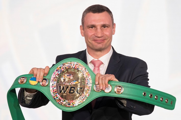 Перший такий пояс із українським прапором на передньому плані логотипу Маурісіо Сулейман вручив вічному чемпіону WBC Віталію Кличку.
