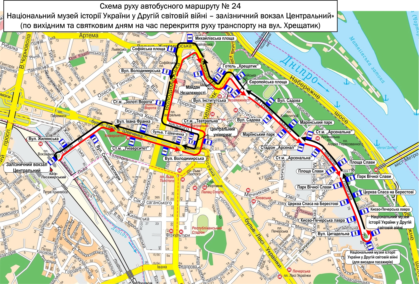 З 21 червня до 6 вересня 2016 року на період капітального ремонту ескалаторів на станції метро «Вокзальна» рух автобусів № 24 буде організовано за маршрутом: «Національний музей історії України в Другій світовій війні – залізничний вокзал «Центральний»».