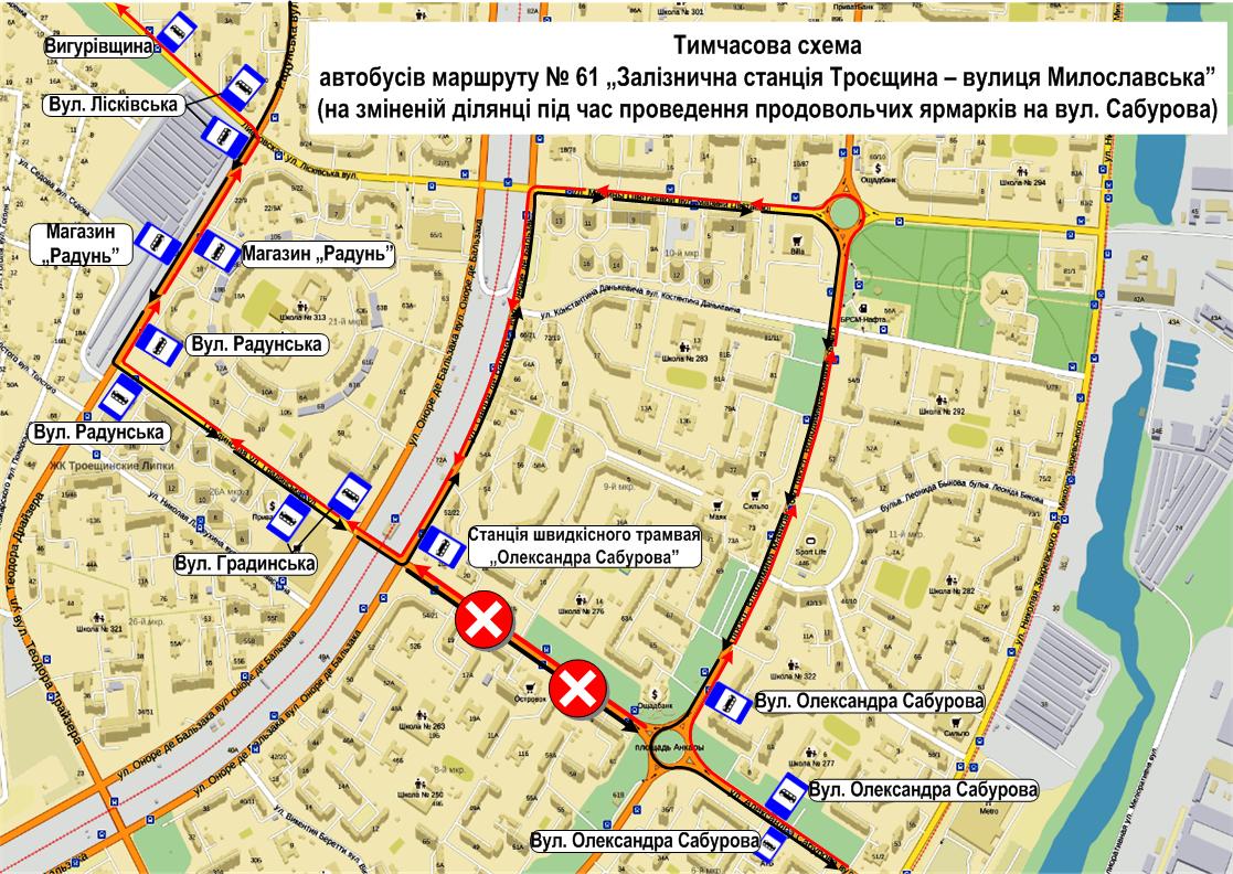 На вул. Олександра Сабурова на ділянці від вул. Оноре де Бальзака до просп. Володимира Маяковського рух автобусів маршруту № 61 буде організовано від вул. Милославської до вул. Градинської – за діючою схемою, далі: вул. Оноре де Бальзака (парна сторона) – вул. Марини Цвєтаєвої – просп. Володимира Маяковського – вул. Олександра Сабурова, далі – за діючою схемою.