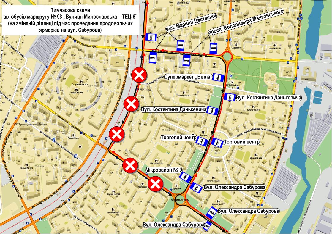 На вул. Олександра Сабурова на ділянці від вул. Оноре де Бальзака до просп. Володимира Маяковського рух автобусів маршруту № 98 буде організовано від вул. Милославської до вул. Оноре де Бальзака – за діючою схемою, далі: вул. Марини Цвєтаєвої – просп. Володимира Маяковського – вул. Олександра Сабурова, далі – за діючою схемою.
