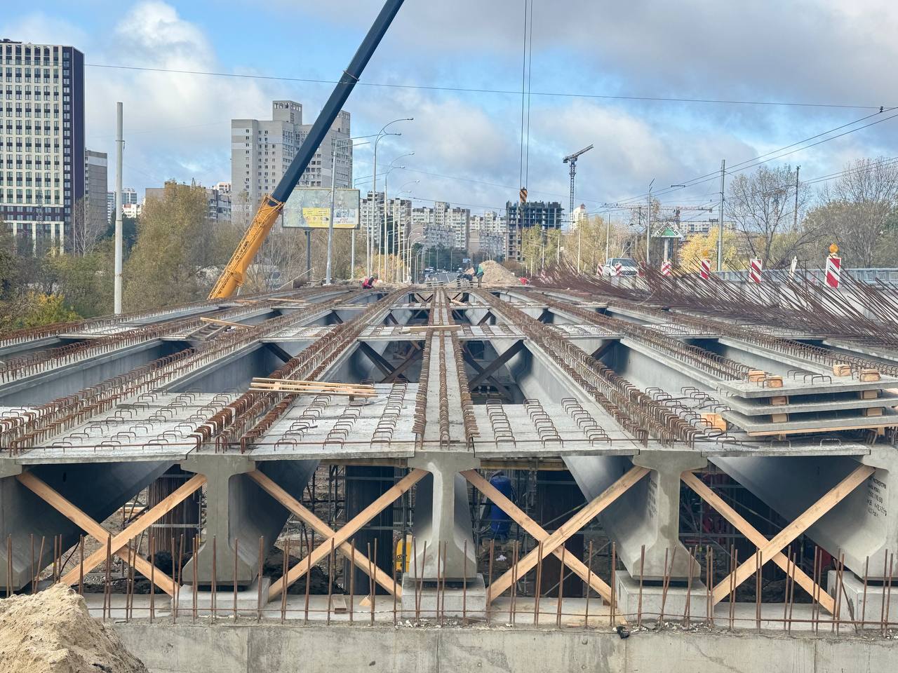 Починається наступний етап: армування прогонових будов, улаштування монолітної плити проїжджої частини та тротуару, монтаж карнизних блоків, перильного та бар’єрного огороджень.