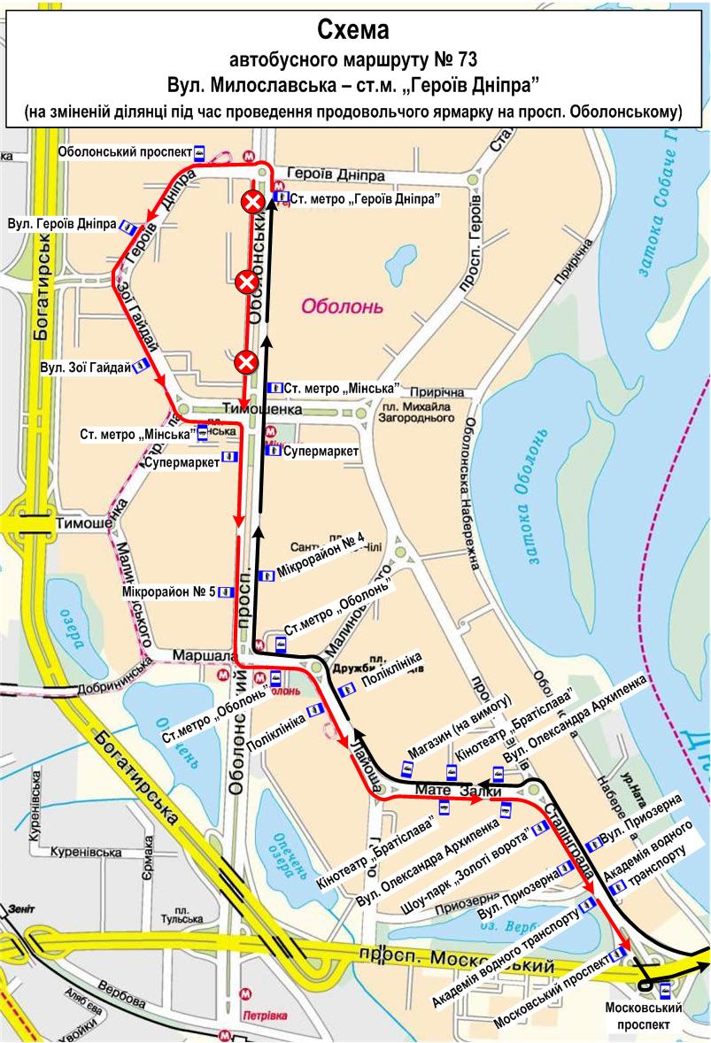 20 листопада 2016 року у зв’язку з проведенням продовольчого ярмарку на просп. Оболонському (на ділянці від вул. Героїв Дніпра до вул. Маршала Тимошенка) рух автобусів маршруту № 73 в напрямку вул. Милославської буде організовано за трасою: ст. м. «Героїв Дніпра» – вул. Героїв Дніпра – вул. Зої Гайдай – вул. Маршала Тимошенка – просп. Оболонський, і далі за діючою трасою.