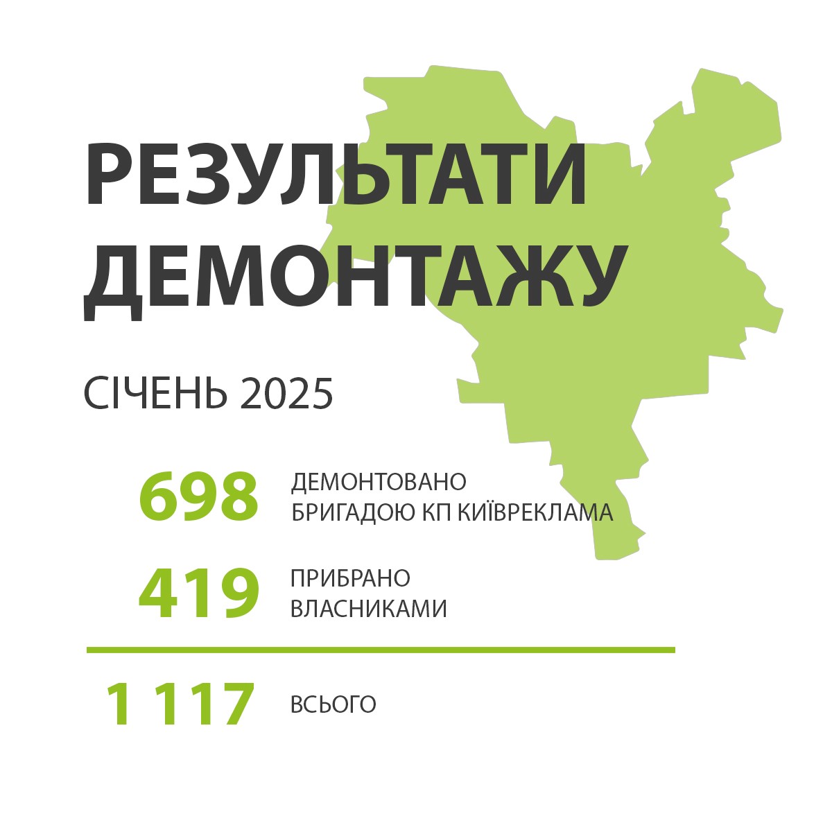Із них 698 об’єктів демонтували безпосередньо бригади КП «Київреклама», ще 419 конструкцій власники прибрали самостійно після відповідних приписів.