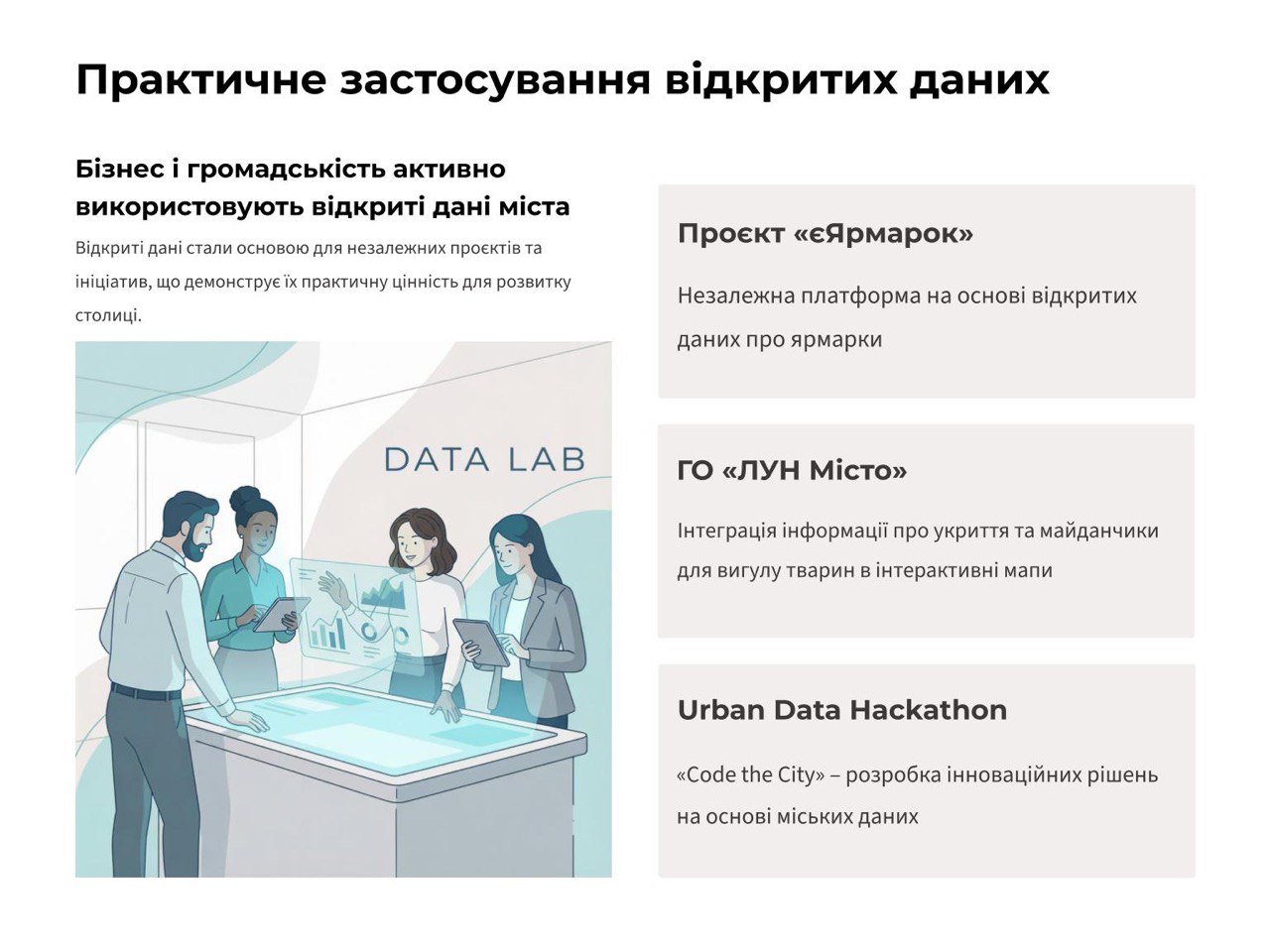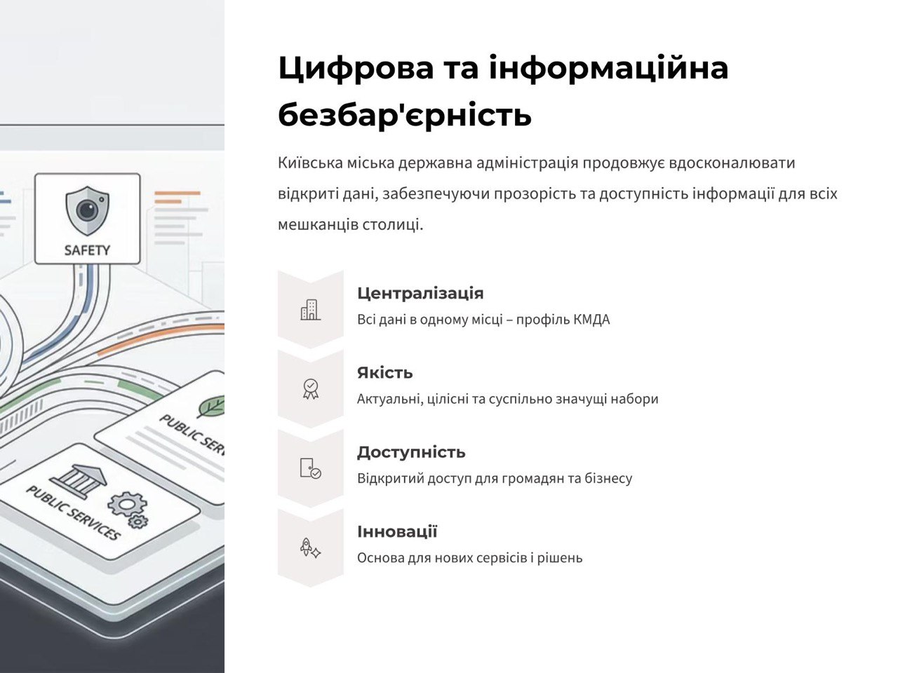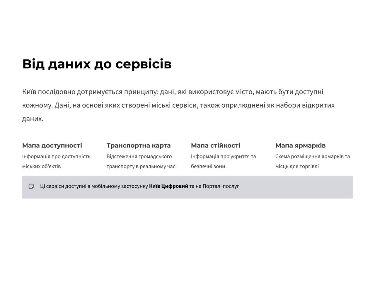 Київ послідовно дотримується принципу: дані, які використовує місто, мають бути доступні кожному. Дані, на основі яких створені міські сервіси, також оприлюднені як набори відкритих даних. Зокрема, це Мапа доступності, Транспортна карта, Мапа стійкості та Мапа ярмарків у мобільному застосунку Київ Цифровий. Оприлюднення цих даних здійснюється завдяки злагодженій співпраці апарату КМДА, КП «ГІОЦ» і відповідних структурних підрозділів КМДА – розпорядників інформації.