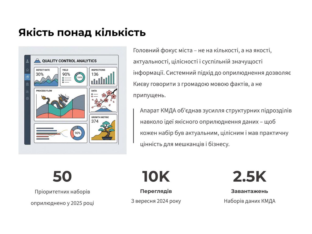 «У 2025 році місто зосереджується на якісному та централізованому підході в оприлюдненні відкритих даних. Ми об’єднали зусилля структурних підрозділів навколо ідеї якісного оприлюднення даних – щоб кожен набір був актуальним, цілісним і мав практичну цінність для мешканців і бізнесу. Адже саме системний підхід до оприлюднення інформації дозволяє місту говорити з громадою мовою фактів, а не припущень. Так, Київ цьогоріч оприлюднив 50 пріоритетних наборів даних», – повідомив керівник апарату КМДА Дмитро Загуменний.