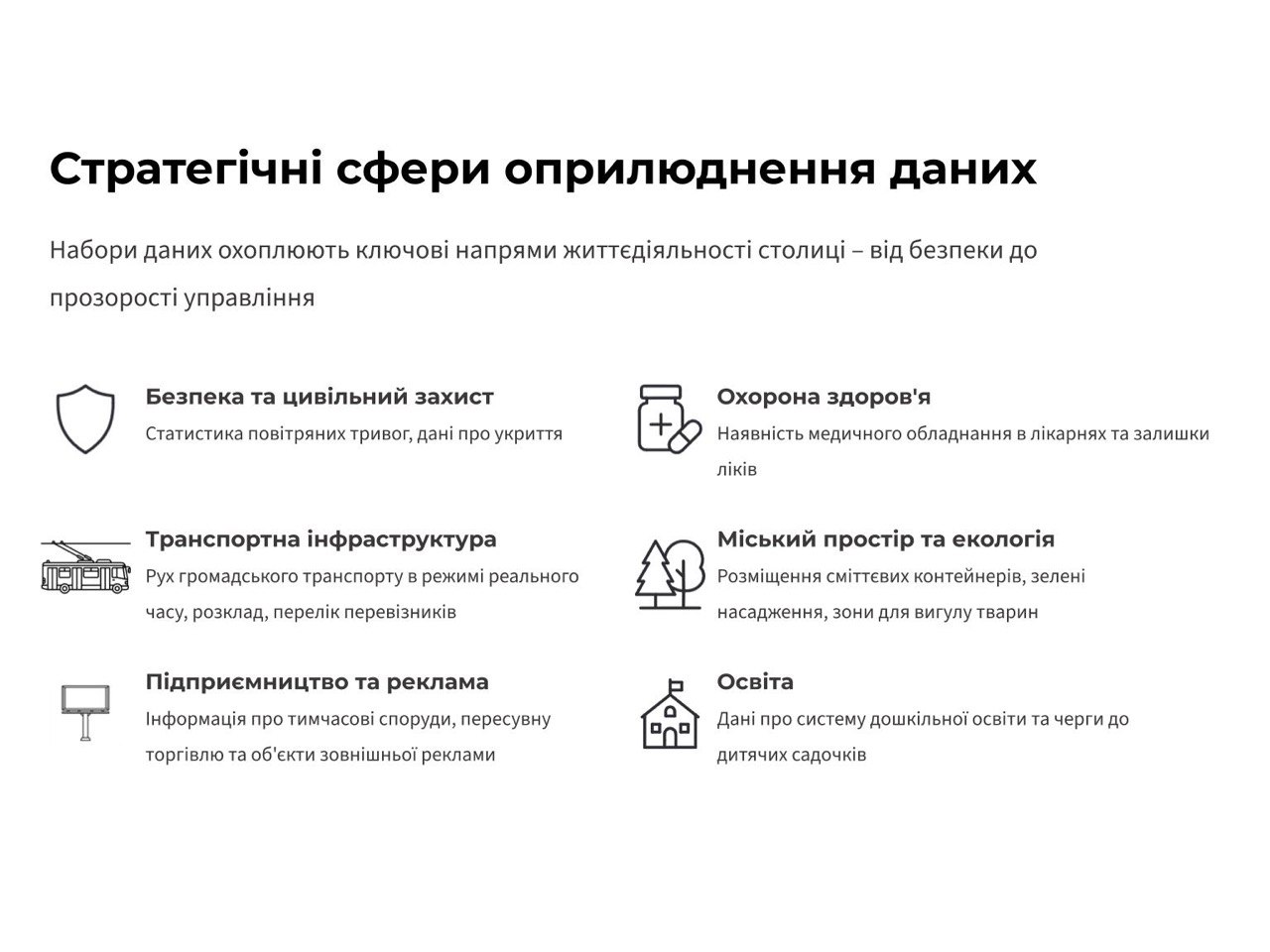 Він додав, що набори даних стосувалися стратегічних сфер життєдіяльності столиці, зокрема: