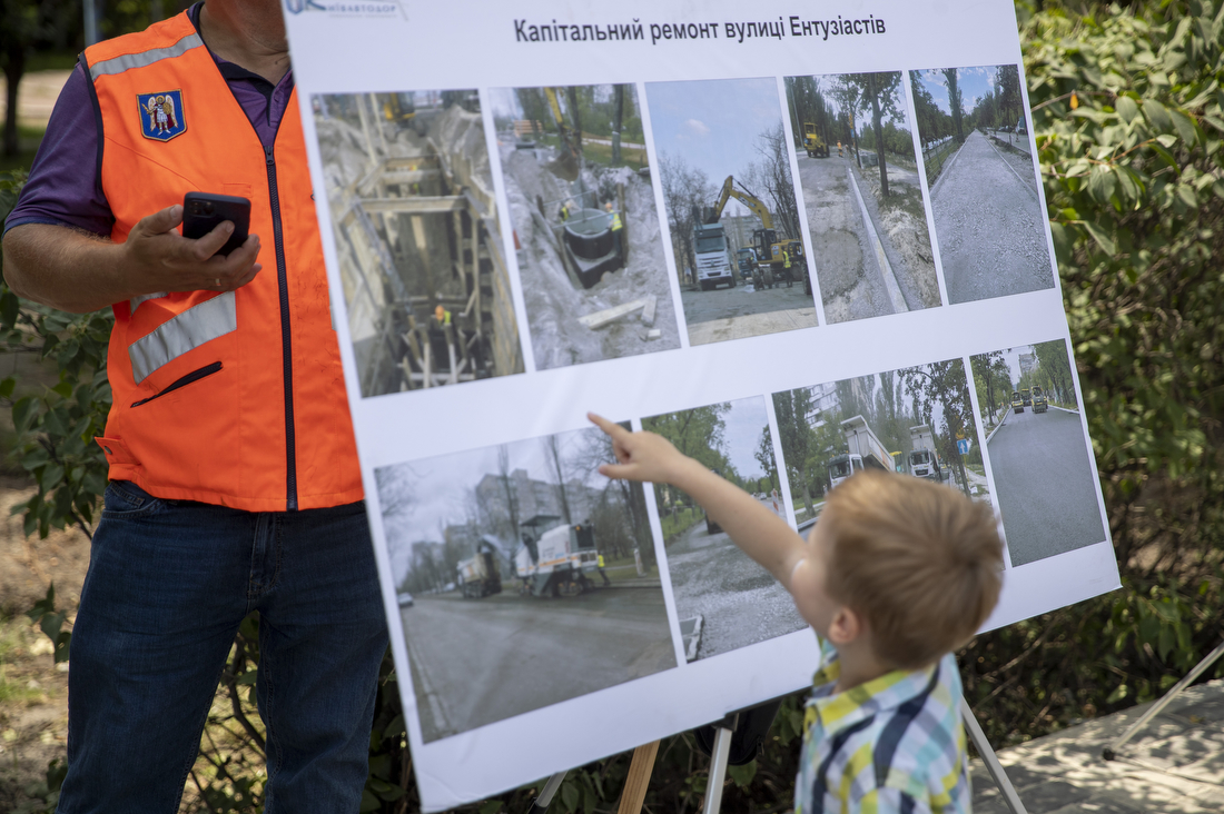 «Перевірив, як триває капремонт вулиці Ентузіастів у Дніпровському районі столиці. Останній раз цю вулицю оновлювали понад 40 років тому. Протяжність ділянки, яку ремонтують, – майже 3 кілометри. Уже влаштували нову мережу дощової каналізації. Встановили новий гранітний камінь обабіч дороги, нанесли два шари асфальту. Скоро розпочнуть влаштування третього шару з асфальтобетону. Також на цій вулиці будуть сучасні та безпечні пішохідні переходи, оновлять і тротуари, облаштують велодоріжки та встановлять нову систему вуличного освітлення й антипаркувальні стовпчики. Капітальний ремонт вулиці Ентузіастів плануємо завершити в жовтні цього року», – розповів Віталій Кличко.