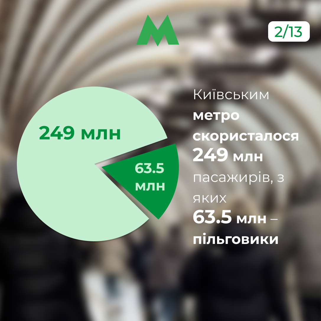 У 2025 році столичним метро скористалися майже 250 мільйонів пасажирів. Із них 63,5 мільйона – пільговики. Про це інформують у КП «Київський метрополітен».