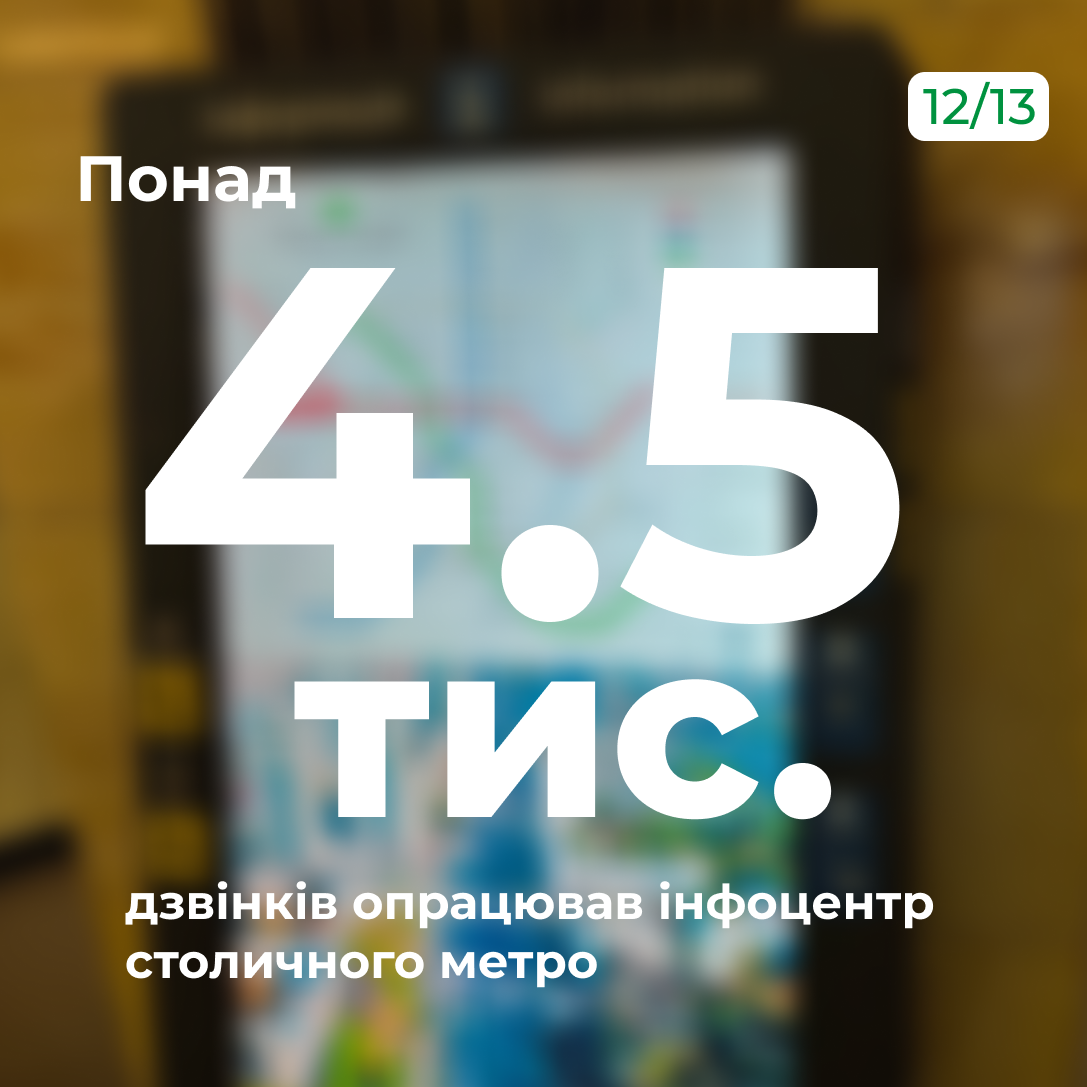 Нагадаємо, що для пасажирів цілодобово працює довідковий центр за телефонами: (044) 238-45-26, 050-448-91-71. Також можна писати та надсилати інформацію у Viber. За підсумками року інфоцентр метро обробив понад 4 500 запитів від пасажирів.
