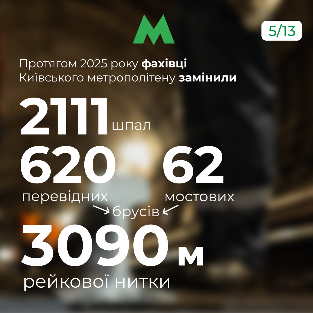 Попри постійні ворожі обстріли та нічні тривоги, фахівці столичного метро проводили планові роботи з утримання інфраструктури. Зокрема, замінили 2 111 шпал, 620 перевідних і 62 мостові бруси, а також 3 090 метрів рейкової нитки.