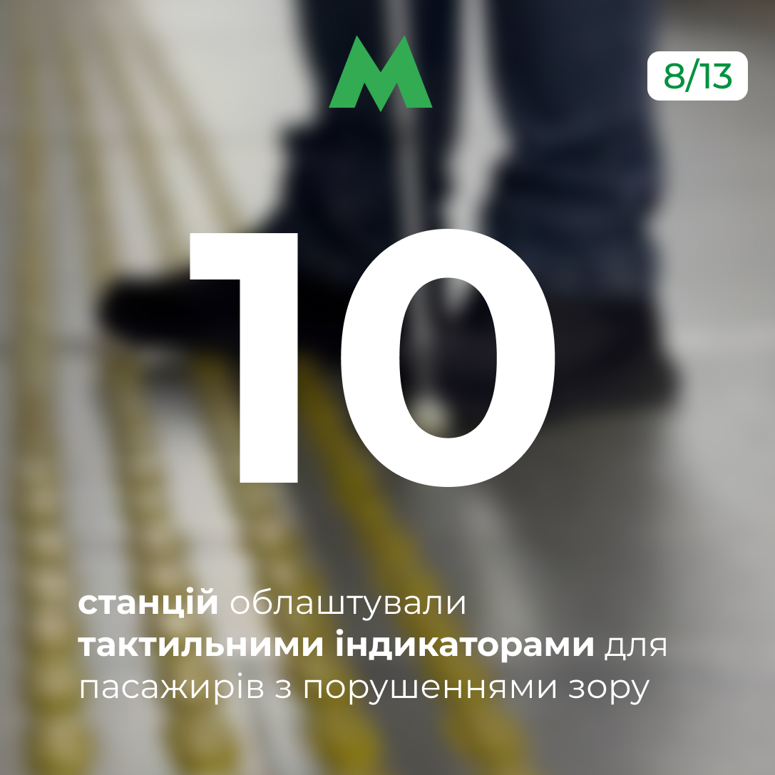 Восени 2025-го розпочали роботи з покращення доступності станцій. Так, на 10 станційних комплексах нанесені тактильні смуги, які допомагають орієнтуватися та безпечно переміщатися станціями підземки пасажирам із порушеннями зору. Ці роботи проводять у межах виконання Плану заходів із створення безбар’єрного простору в місті Києві, затвердженого мером Віталієм Кличком.