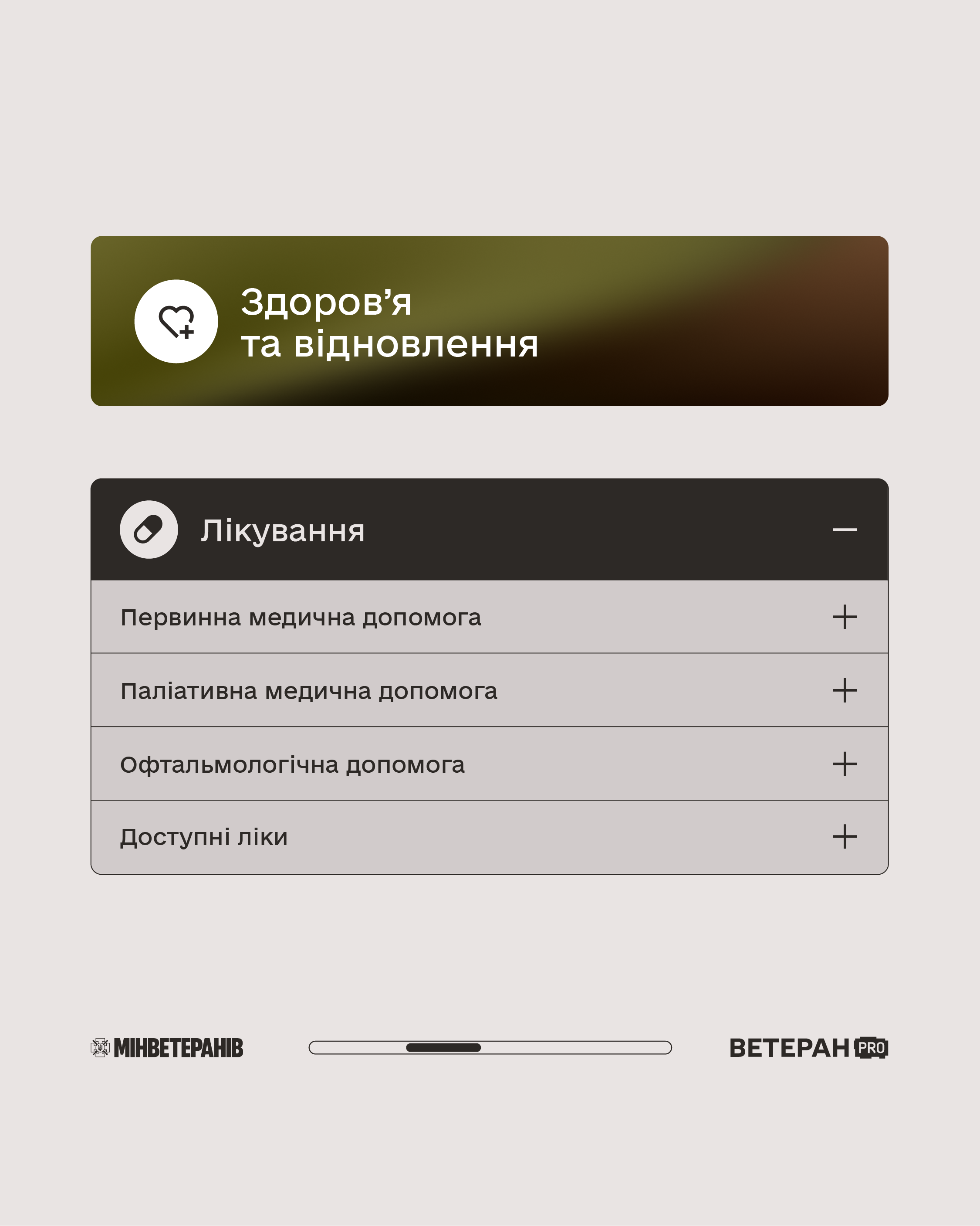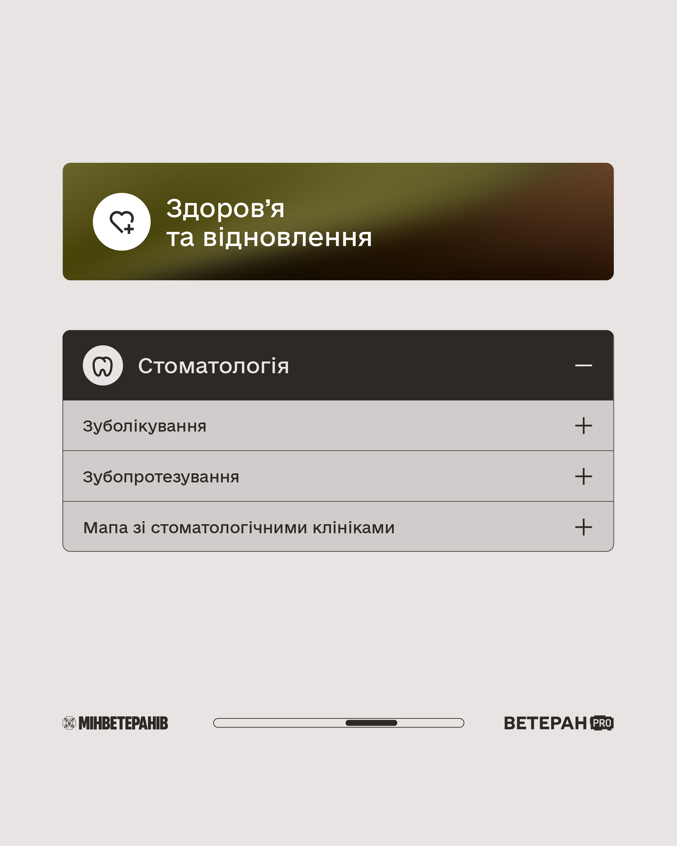 - Здоров’я та відновлення (лікування, протезування, стоматологія, реабілітація, психологічна допомога).