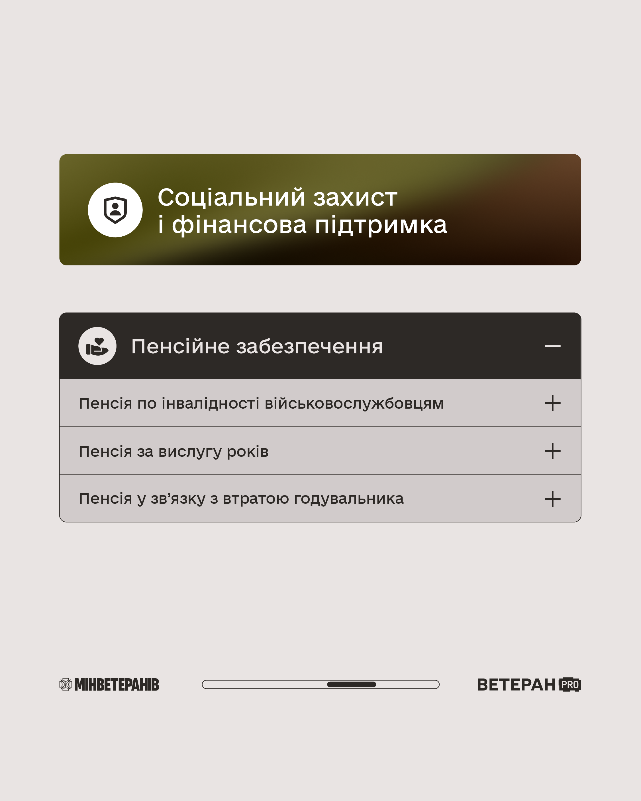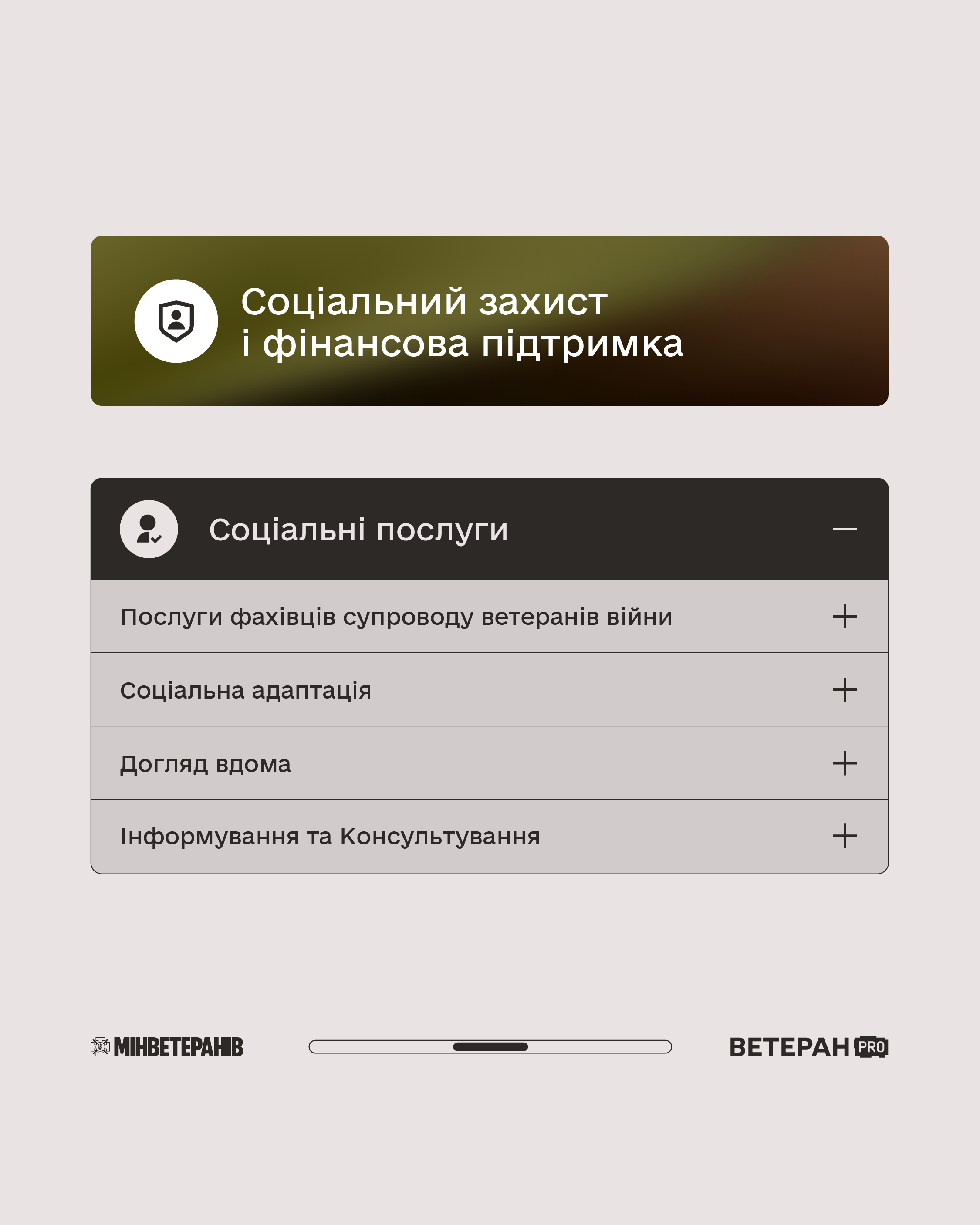 - Соціальний захист і фінансова підтримка (соціальні послуги, виплати, пенсійне забезпечення, адаптація).